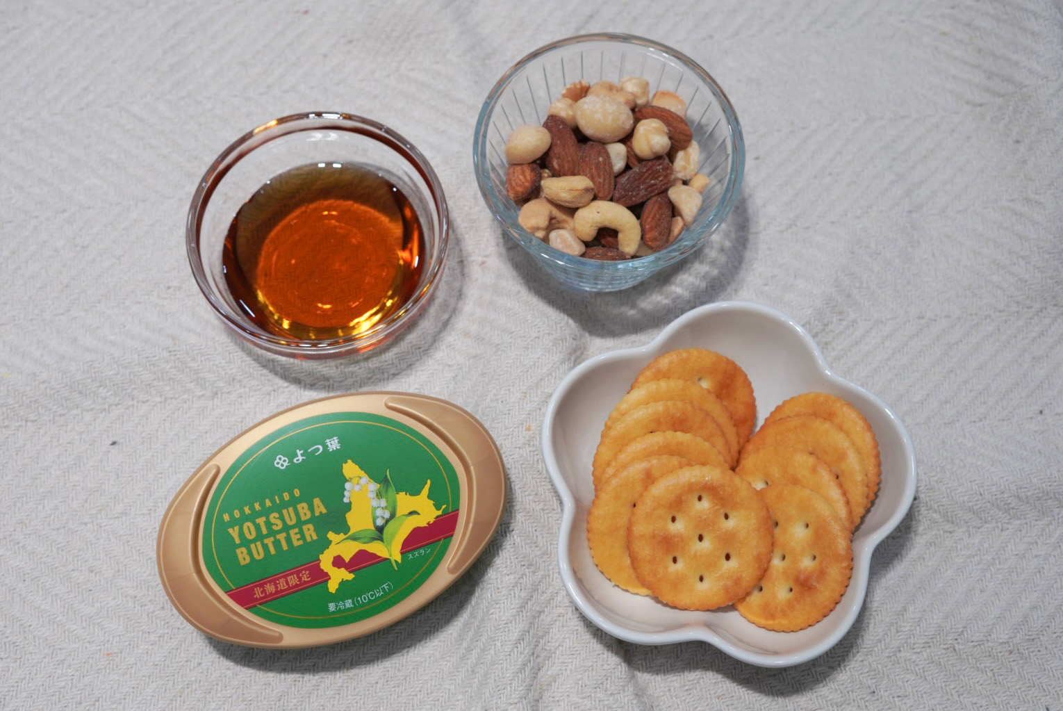 - 將切好堅果碎放在抹好四葉北海道奶油的餅乾上面。
