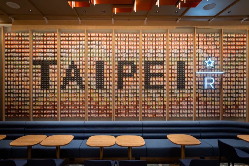 全新藝術裝置「DREAM PLAZA台北牆」,以品牌經典元素豆標卡拼貼出「TAIPEI」字樣,每一張卡片皆代表一款全球小批次咖啡,象徵台北與世界咖啡文化的深度連結。此面藝術牆展現星巴克對咖啡產地與烘焙工藝的尊重,邀請顧客探索每一張豆標背後的風味故事,進而感受全球咖啡社群的多元與溫度。
