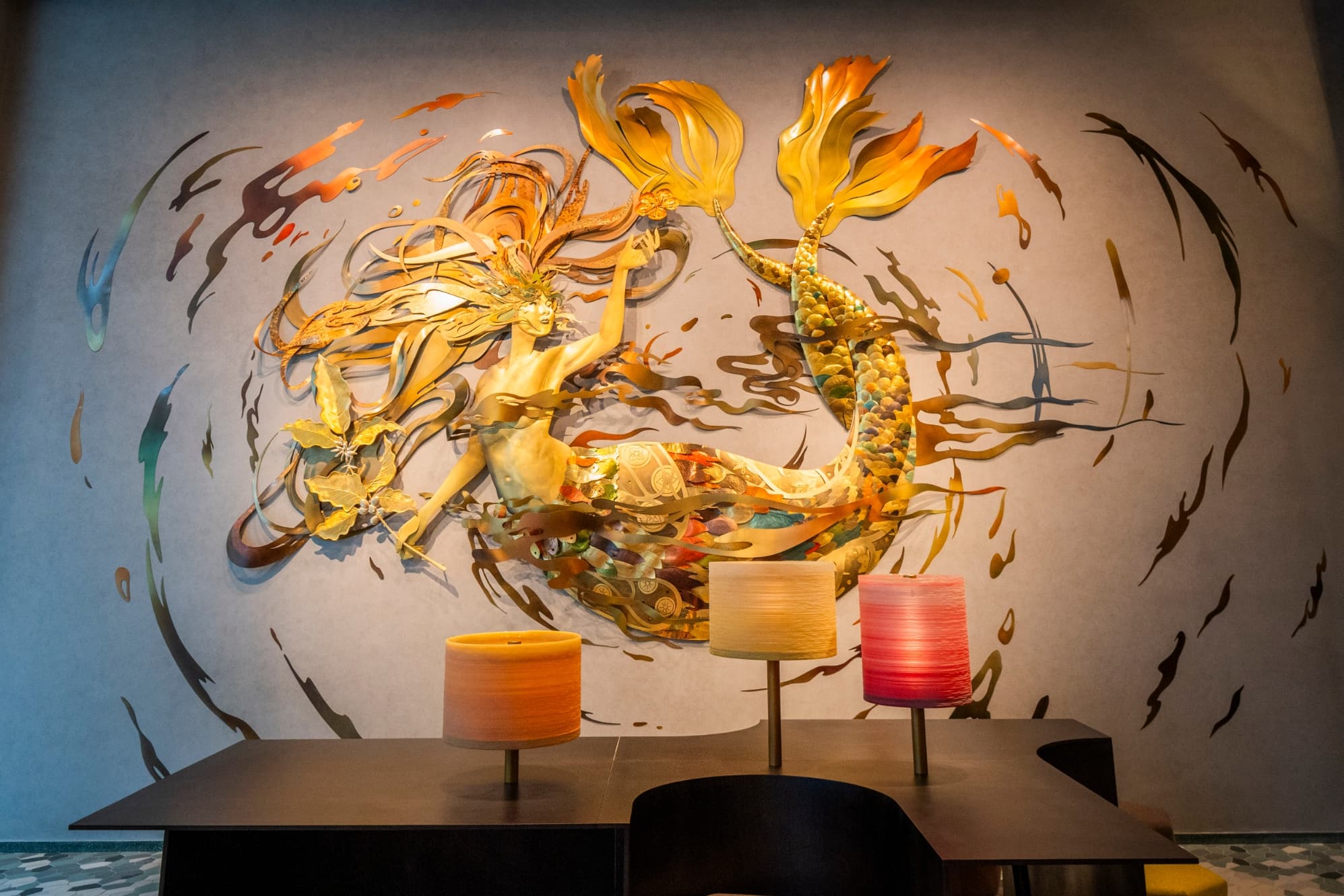 門市內藝術品橫跨數位生成藝術、金屬雕塑、手工彩繪、編織裝置與複合媒材,涵蓋十件作品,包括《咖啡幻夢》、《閃耀女神》、《立體風味》、《咖啡百景》、《文化連結》、《魔幻時刻》、《四季舞動》、《咖啡與萬物共生》、《解壓縮》及《匯載》。這些作品融合在地文化、自然意象與創新工藝,不僅呈現咖啡風味背後的細緻旅程,更體現永續理念與藝術實驗的精神,期待顧客能在這場橫跨文化與感官的藝術旅程中,沉浸於多元媒材的探索,激發對話與交流的靈感,傳遞人與人之間的真摯連結,以喜悅之姿傳遞希望,並為夥伴及顧客喚起驕傲與歸屬感的共鳴。