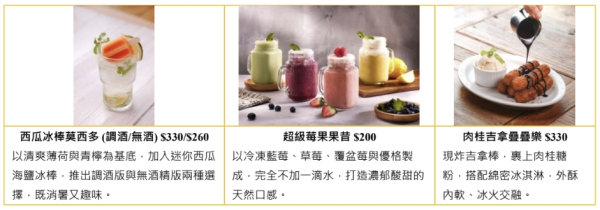 你喝過有冰棒的飲料嗎?「西瓜冰棒莫西多」以清爽的薄荷和檸檬味為基底,加入整根西瓜海鹽冰棒,不只外型獨特風味也超有層次,調酒版和無酒精版讓全家大小都能享受沁涼消暑好滋味!健康族必點「超級莓果果昔」以藍莓、草莓、覆盆莓與優格製成,完全不加一滴水讓口感濃郁酸甜,真的很超級!美式不能錯過的甜點「肉桂吉拿疊疊樂」現炸吉拿棒搭配綿密的冰淇淋,外酥內軟、冰火交融、甜而不膩的口感,幸福感在嘴裡大爆發,真是太幸福了!