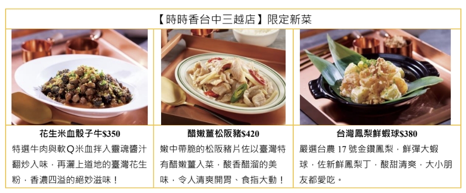 同為瓦城集團旗下品牌的「瓦城」及「時時香」同步推出三款限定新菜色,瓦城經典的月亮蝦餅選用100%純鮮蝦製作,搭配濃郁黑松露醬升級為「黑松露月亮」,讓風味層次更上一層樓,喜歡月亮蝦餅的人肯定會愛上!時時香則推出「花生米血骰子牛」特選骰子牛、台灣道地花生粉、米血及靈魂醬汁的絕妙組合,香味四溢讓人忍不住一口接一口!此外,10/2前至瓦城/時時香台中三越店內用,即享當日消費wa10點數雙倍贈回饋,無論是閨蜜甜蜜聚會、家人團聚,或是好友聚餐,透過美食連結情感,到瓦城集團共度充滿溫度的時刻。