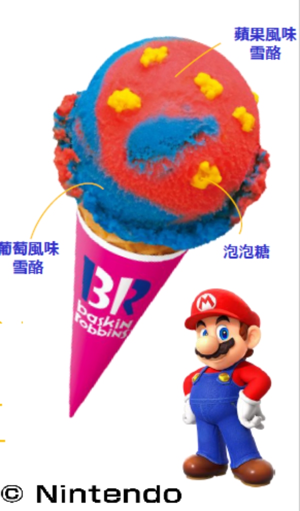 紅色的部分,是香甜多汁的蘋果風味雪酪。藍色的部分,是又香又酸甜的葡萄風味雪酪。除此之外,還有黃色部分則是以瑪利歐與夥伴們的大冒險為概念,用黃色泡泡糖點綴其中。泡泡糖也是首次在31冰淇淋的口味中登場。